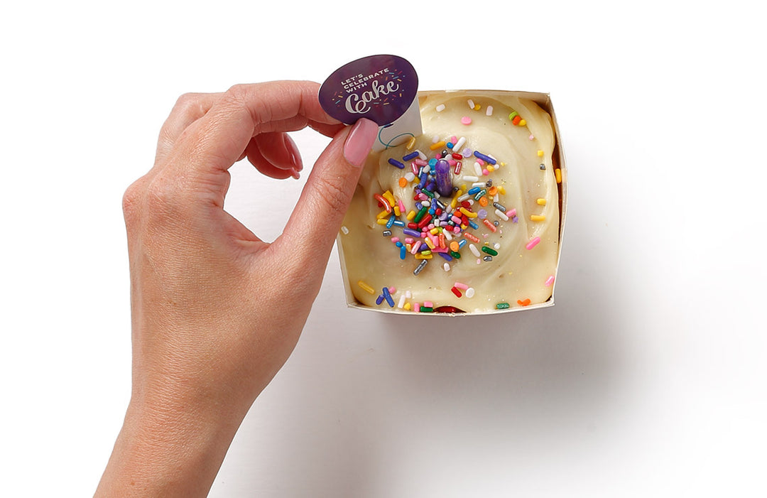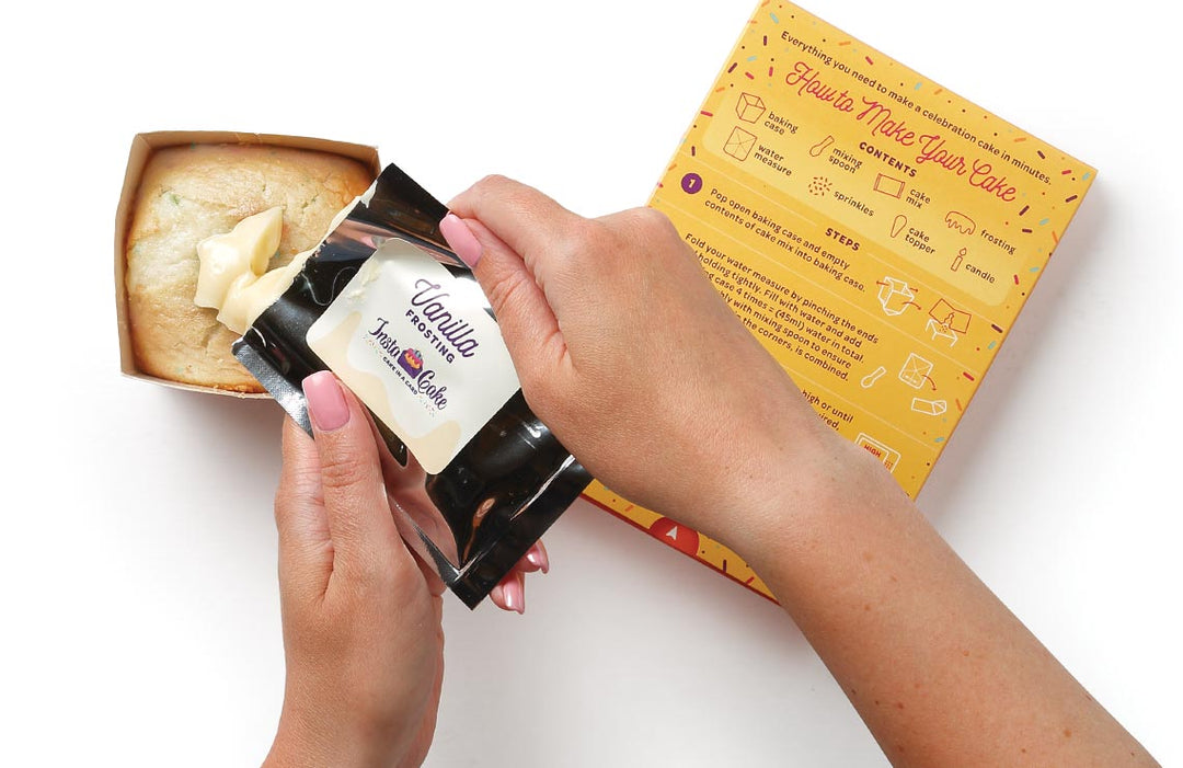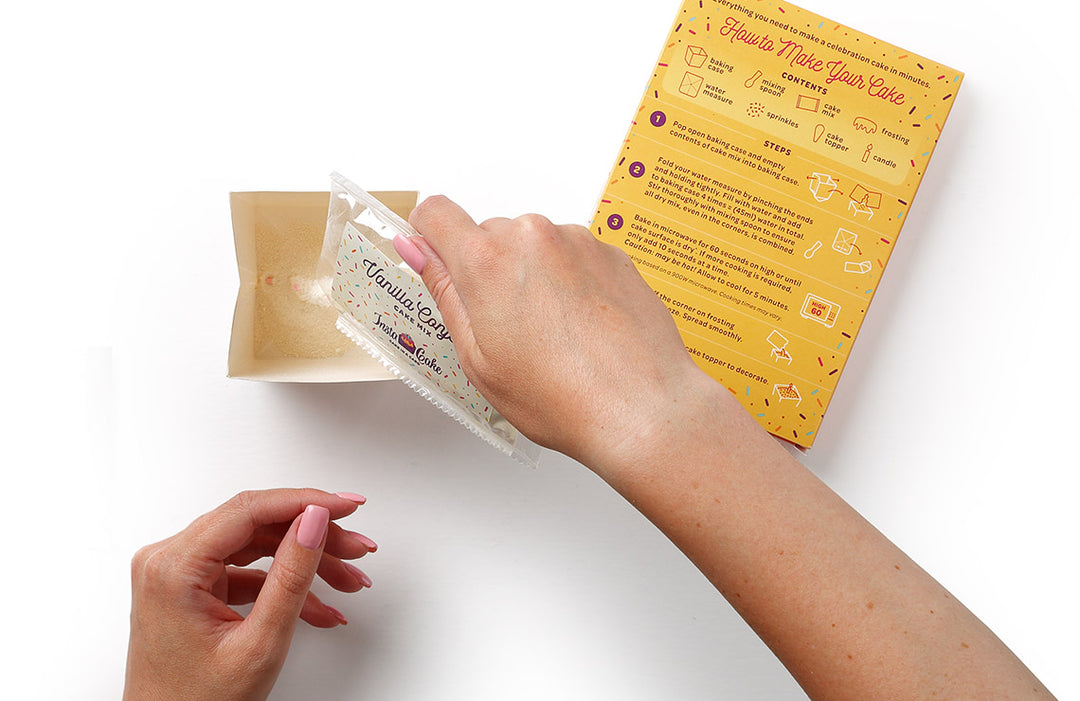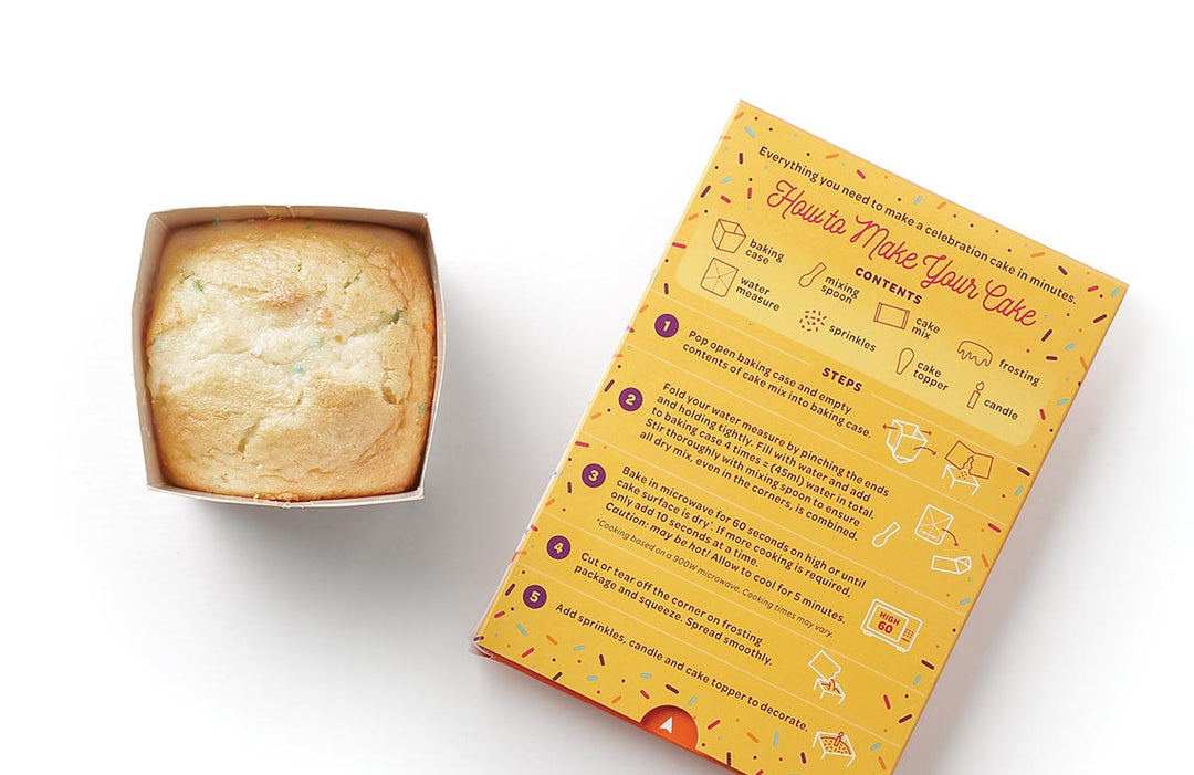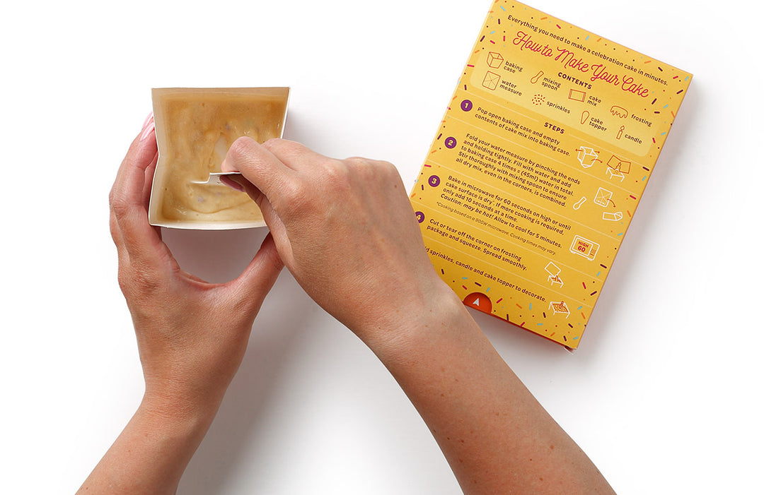 Bake in microwave for 60 seconds on high or until cake surface is dry*. If more cooking is required, only add 10 seconds at a time. Caution: may be hot! Allow the cake to cool for 5 minutes.